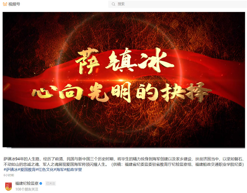 11月29日,由福建省紀(jì)委監(jiān)委駐省教育廳紀(jì)檢監(jiān)察組和福建船政交通職業(yè)學(xué)院紀(jì)委聯(lián)合制作的船政先賢家風(fēng)家訓(xùn)宣傳片《薩鎮(zhèn)冰:心向光明的抉擇》在“福建紀(jì)檢監(jiān)察”視頻號推送。
