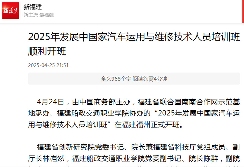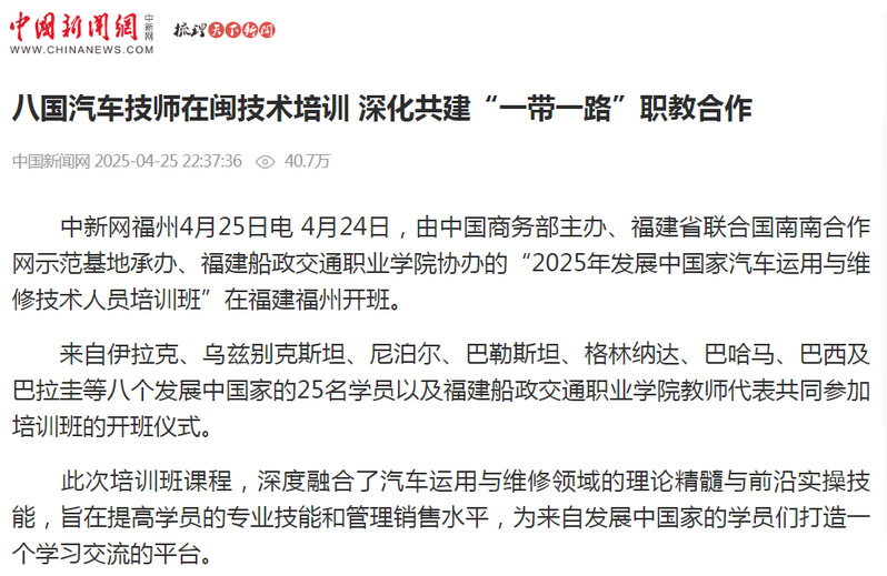 中新網(wǎng)福州4月25日電 4月24日,由中國商務(wù)部主辦、福建省聯(lián)合國南南合作網(wǎng)示范基地承辦、福建船政交通職業(yè)學院協(xié)辦的“2025年發(fā)展中國家汽車運用與維修技術(shù)人員培訓(xùn)班”在福建福州開班。 來自伊拉克、烏茲別克斯坦、尼泊爾、巴勒斯坦、格林納達、巴哈馬、巴西及巴拉圭等八個發(fā)展中國家的25名學員以及福建船政交通職業(yè)學院教師代表共同參加培訓(xùn)班的開班儀式。 此次培訓(xùn)班課程,深度融合了汽車運用與維修領(lǐng)域的理論精髓與前沿實操技能,旨在提高學員的專業(yè)技能和管理銷售水平,為來自發(fā)展中國家的學員們打造一個學習交流的平臺。 培訓(xùn)期間,學員們將前往寧德時代、寧德上汽和廈門金龍等企業(yè)參觀考察,與一線從業(yè)人員深入交流,近距離洞察汽車產(chǎn)業(yè)的最新技術(shù)趨勢與行業(yè)脈動,汲取國際領(lǐng)先的企業(yè)管理經(jīng)驗與創(chuàng)新實踐成果。 發(fā)展中國家汽車運用與維修技術(shù)培訓(xùn)班迄今已承辦2期,共來自13個發(fā)展中國家的54名學員參加教學培訓(xùn)。作為共建“一帶一路”教育行動的實踐案例,福建船政交通職業(yè)學院與中航國際合作,在肯尼亞、烏干達、科特迪瓦、加蓬等國家設(shè)立職業(yè)教育基地,提供師資培訓(xùn)和職業(yè)教育支持,培養(yǎng)當?shù)芈殬I(yè)技術(shù)人才;聯(lián)合廈門金龍等本土企業(yè),創(chuàng)新實施“海外技師培養(yǎng)計劃”,在中東、非洲等地共建“海絲學院”,形成“技術(shù)培訓(xùn)-產(chǎn)業(yè)孵化-文化互鑒”的立體化合作矩陣。福建船政交通職業(yè)學院相關(guān)負責人表示,未來,該校將與各友好國家繼續(xù)堅持共商共建共享原則,加強互聯(lián)互通合作,合力講好船政交通人共建“一帶一路”故事,為全球職業(yè)教育共同體建設(shè)注入中國智慧和責任擔當。(完)4月24日,由中國商務(wù)部主辦,福建省聯(lián)合國南南合作網(wǎng)示范基地承辦、福建船政交通職業(yè)學院協(xié)辦的“2025年發(fā)展中國家汽車運用與維修技術(shù)人員培訓(xùn)班”在福建福州正式開班。福建省創(chuàng)新研究院黨委書記、院長兼福建省科技廳黨組成員、副廳長林巋然,福建船政交通職業(yè)學院黨委副書記、院長陳群,副院長陳常暉與來自伊拉克、烏茲別克斯坦、尼泊爾、巴勒斯坦、格林納達、巴哈馬、巴西及巴拉圭等8個發(fā)展中國家的25名學員以及學院教師代表共同參加培訓(xùn)班的開班儀式。開班儀式由福建省聯(lián)合國南南合作網(wǎng)示范基地主任張華主持。