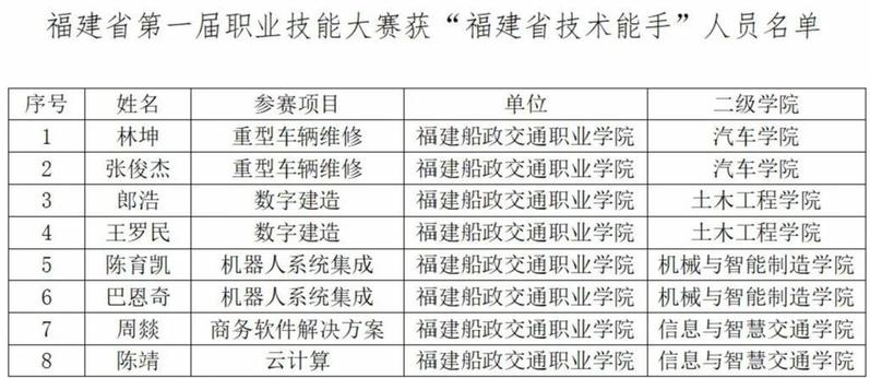 近日,福建省人力資源和社會(huì)保障廳對(duì)在2024年福建省第一屆職業(yè)技能大賽中取得優(yōu)異成績(jī)的選手授予“福建省技術(shù)能手”稱號(hào),學(xué)院共有9名選手獲得表彰,數(shù)量在省內(nèi)高職院校居首!具體名單如下: