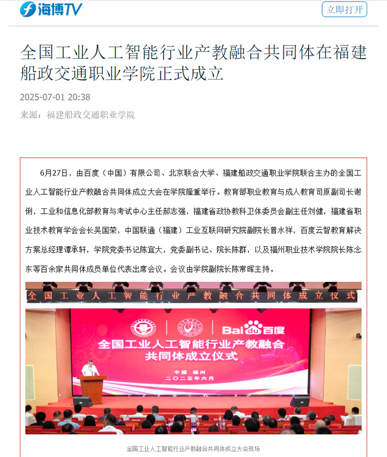 6月27日,由百度(中國)有限公司、北京聯(lián)合大學(xué)、福建船政交通職業(yè)學(xué)院聯(lián)合主辦的全國工業(yè)人工智能行業(yè)產(chǎn)教融合共同體成立大會在學(xué)院隆重舉行。海博TV等媒體平臺對此進行宣傳報道。