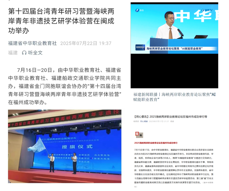 7月15日-17日,2025海峽兩岸職業(yè)教育論壇在福建省福州市成功舉行。此次論壇以“AI賦能職業(yè)教育”為主題,由中華職業(yè)教育社、福建省中華職業(yè)教育社聯(lián)合臺灣多家社會團體共同主辦,福建船政交通職業(yè)學(xué)院承辦,《教育與職業(yè)》雜志社協(xié)辦。論壇期間,第十四屆臺灣青年研習(xí)營暨海峽兩岸青年非遺技藝研學(xué)體驗營同步舉辦。本次論壇獲得了新華社、人民網(wǎng)、中國臺灣網(wǎng)、中國教育報、經(jīng)濟日報、中國新聞網(wǎng)、中華職業(yè)教育社、福建省中華職業(yè)教育社、福建電視臺、同心福建等十多家主流媒體報道。