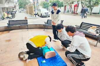 在急救救護科普活動現(xiàn)場,志愿者們向居民講解心肺復蘇救護和包扎的基本知識以及應用環(huán)境,隨后居民們在志愿者們的協(xié)助下進行實操。通過在仿真人體模型上演示心肺復蘇救護,真人練習繃帶包扎,讓居民們對急救知識有了更深刻的認識與了解。