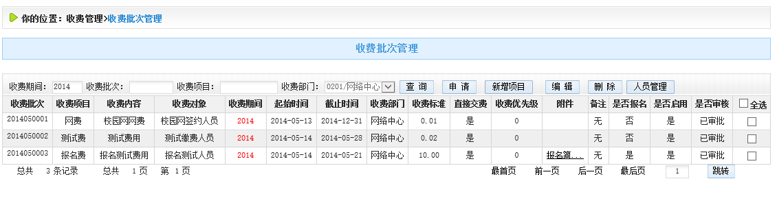 收費批次管理包括:收費批次申請、查詢、新增項目、編輯和刪除等功能。如圖4.2.2-1所示: