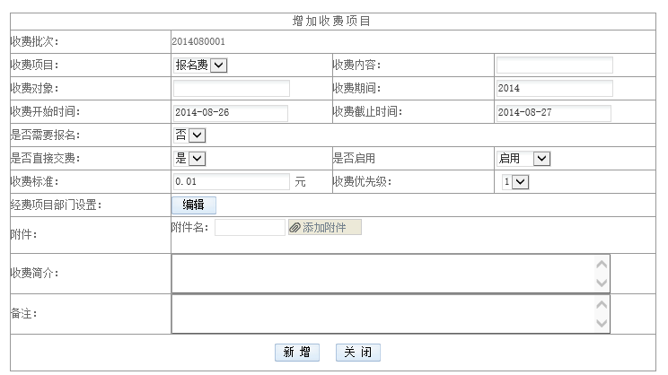 3)收費開始、截止時間:定義收費起止時間,學生只能在該期間內(nèi)繳費。