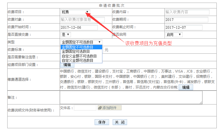 5)收費類型:充值——對應前臺項目為生活繳費,使用場景:可以允許學生重復繳費的項目,比如一卡通補卡費、停車費。