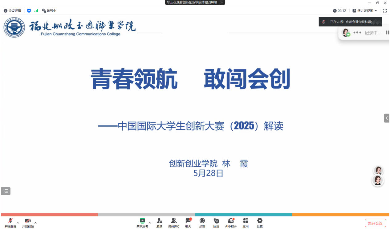 5月28日晚,我校通過騰訊會議舉辦中國國際大學(xué)生創(chuàng)新大賽(2025)專題講座,由創(chuàng)新創(chuàng)業(yè)學(xué)院林霞院長主講,100余名參賽師生聽取講座。