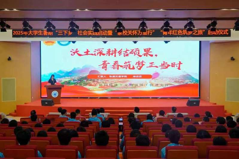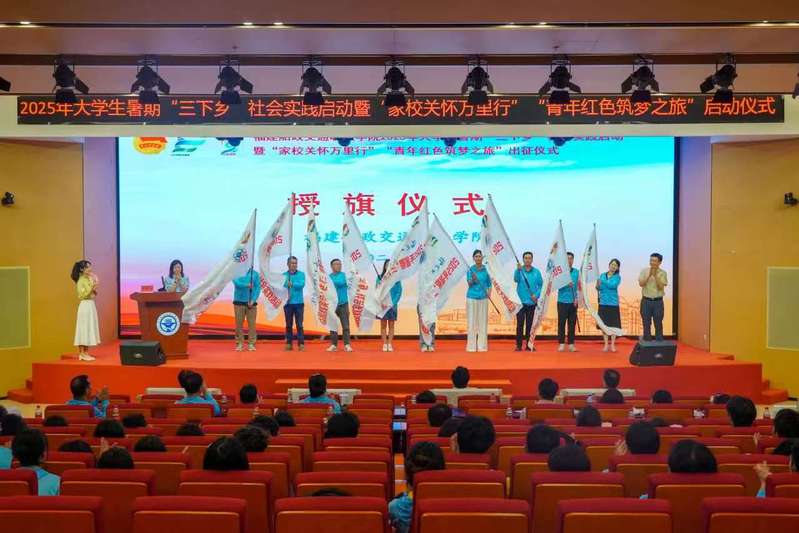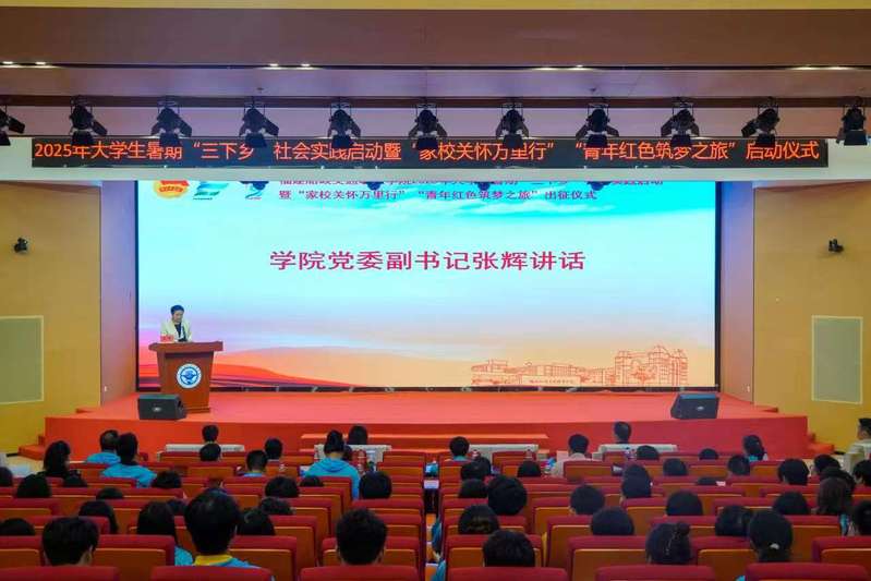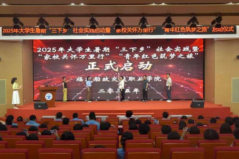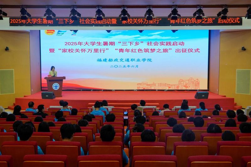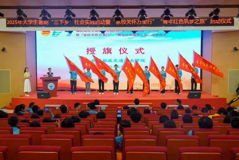 6月25日下午,福建船政交通職業(yè)學(xué)院2025年大學(xué)生暑期“三下鄉(xiāng)”社會(huì)實(shí)踐啟動(dòng)暨 “家校關(guān)懷萬(wàn)里行”“青年紅色筑夢(mèng)之旅”出征儀式在福船園藝新樓331報(bào)告廳舉行。學(xué)院黨委副書(shū)記張輝,黨委宣傳統(tǒng)戰(zhàn)部、學(xué)生工作部、團(tuán)委、創(chuàng)新創(chuàng)業(yè)學(xué)院、馬克思主義學(xué)院等相關(guān)職能部門(mén)、二級(jí)學(xué)院,以及參加大學(xué)生暑期“三下鄉(xiāng)”社會(huì)實(shí)踐“家校關(guān)懷萬(wàn)里行”“青年紅色筑夢(mèng)之旅”的師生代表們參加出征儀式。儀式由學(xué)院團(tuán)委學(xué)生社團(tuán)管理部部長(zhǎng)湯曉玲主持。