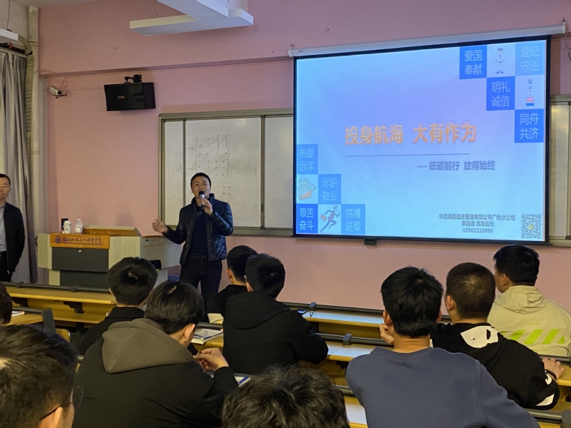 宣講會上,黃福遵副總經(jīng)理向同學們介紹了航運業(yè)的現(xiàn)狀,和公司的基本概況、企業(yè)文化、人才策略、航運行業(yè)的發(fā)展以及公司未來的發(fā)展前景等,引起了同學們濃厚的興趣。企業(yè)介紹了崗位的招聘需求,并對同學們關心的薪酬福利和員工休息休假、勞動合同內(nèi)容等問題進行了詳細的說明。