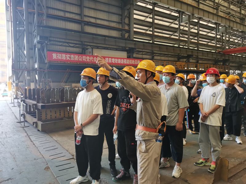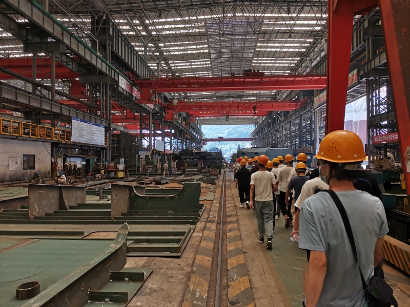 坐在車上從遠(yuǎn)處遙望就可以看見一座石像屹立在前方,那是馬尾造船廠創(chuàng)始人沈葆楨的石像。下了車,馬尾造船廠負(fù)責(zé)人熱情向我們走來,帶著講解員為在場學(xué)生們細(xì)細(xì)講述馬尾造船廠這155年來的建廠史,它濃縮了中國近代富國強(qiáng)兵的探索歷程。隨后,跟隨著講解員的步伐我們來到基地的設(shè)備制造廠,參觀最新的造船設(shè)備,感受精湛的造船工藝。最后,航海學(xué)院師生一行人來到碼頭,參觀造船工藝成果。