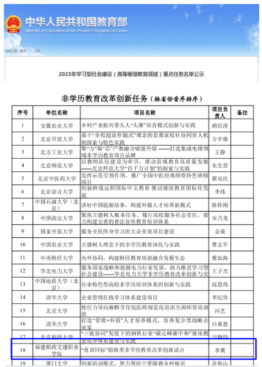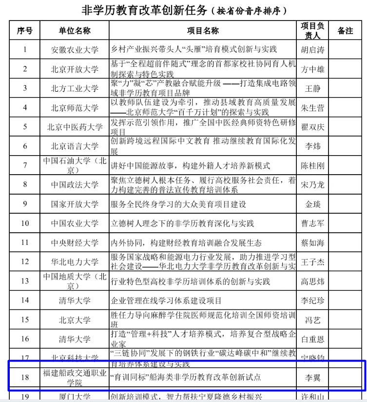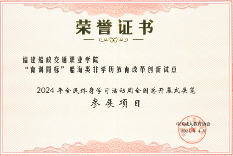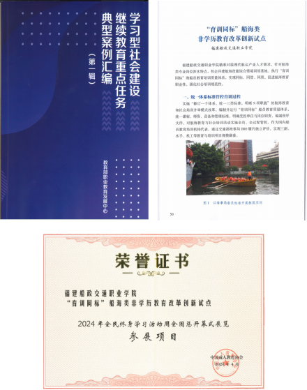 近日,教育部發(fā)布了《2023年學(xué)習(xí)型社會(huì)建設(shè)(高等繼續(xù)教育領(lǐng)域)重點(diǎn)任務(wù)名單》,全國(guó)共有100項(xiàng)學(xué)歷繼續(xù)教育教學(xué)改革創(chuàng)新任務(wù)、100項(xiàng)非學(xué)歷教育改革創(chuàng)新任務(wù)、50項(xiàng)探索三教統(tǒng)籌協(xié)同創(chuàng)新路徑任務(wù)入圍培育建設(shè)名單。由我校航海學(xué)院申報(bào)的《“育訓(xùn)同標(biāo)”船海類非學(xué)歷教育改革創(chuàng)新試點(diǎn)》成功入選非學(xué)歷教育教學(xué)改革創(chuàng)新項(xiàng)目,并作為典型案例在2024年全民終身學(xué)習(xí)活動(dòng)周全國(guó)總開(kāi)幕式上展出。