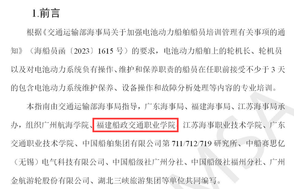 近日,為助力航運(yùn)業(yè)綠色低碳轉(zhuǎn)型發(fā)展,保障電池動(dòng)力船舶運(yùn)營安全,提高電池動(dòng)力船舶船員技能水平,交通運(yùn)輸部海事局組織編寫的《電池動(dòng)力船舶船員培訓(xùn)課程指南》(以下簡稱“《指南》”)正式發(fā)布,福建船政交通職業(yè)學(xué)院組織編寫團(tuán)隊(duì)參與了《指南》“專業(yè)培訓(xùn)”部分的編寫工作,主要涉及電池動(dòng)力系統(tǒng)操作與管理、電池動(dòng)力系統(tǒng)應(yīng)急處理、維護(hù)與故障排查、直流配電系統(tǒng)組成與工作原理等培訓(xùn)內(nèi)容。