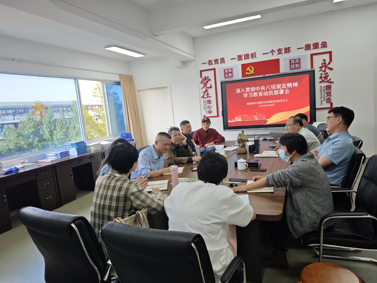 3月28日,航海學(xué)院黨總支召開深入貫徹中央八項(xiàng)規(guī)定精神學(xué)習(xí)教育動(dòng)員部署會(huì)。領(lǐng)導(dǎo)班子成員、副科級(jí)及以上干部、黨支部書記、教研室負(fù)責(zé)人參加會(huì)議。會(huì)議由黨總支書記江文同志主持。