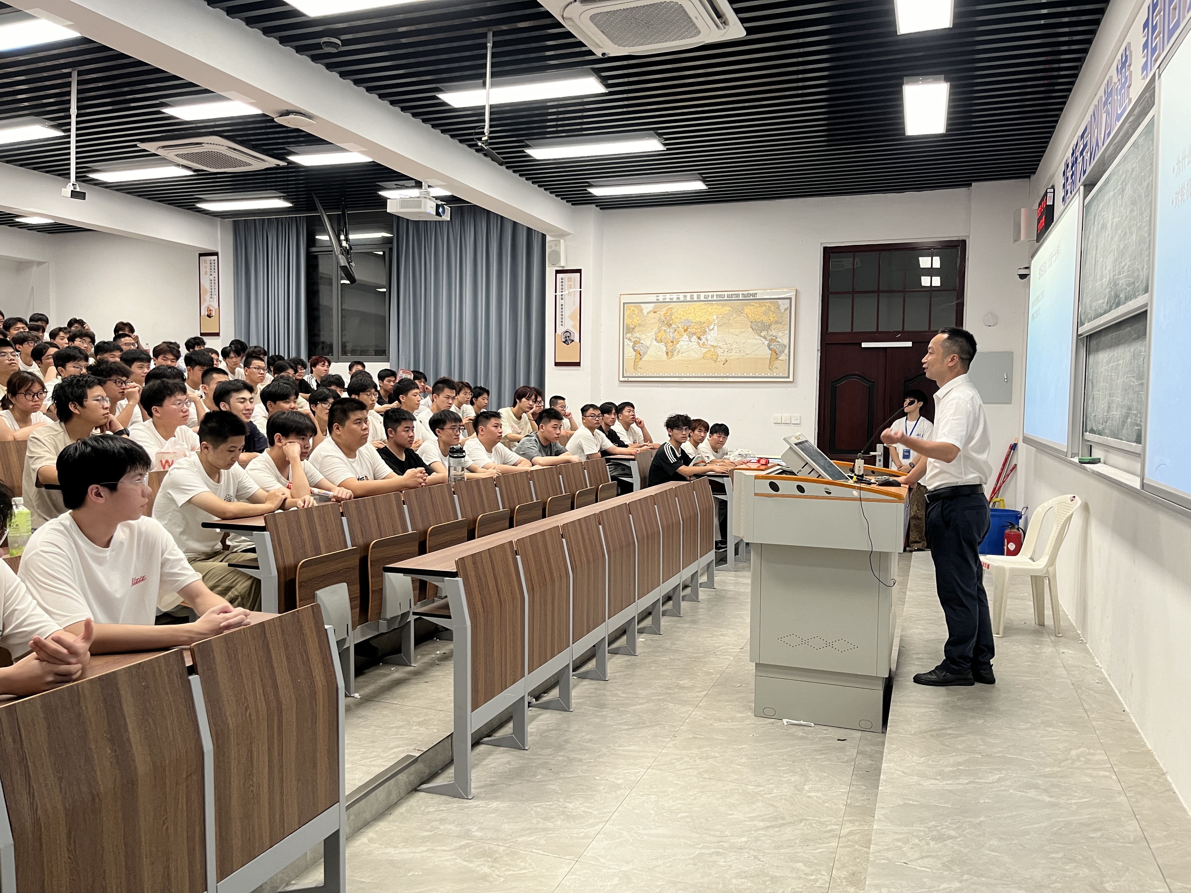 學(xué)院外聘教師福建中平船務(wù)管理公司謝文勝機(jī)務(wù)經(jīng)理和學(xué)院劉建安老師,圍繞輪機(jī)工程技術(shù)專業(yè)的發(fā)展歷程、行業(yè)前景及學(xué)校專業(yè)建設(shè)成果展開(kāi)介紹,強(qiáng)調(diào)該專業(yè)在船舶動(dòng)力系統(tǒng)運(yùn)維、海洋裝備保障等領(lǐng)域的重要作用和發(fā)展前景,鼓勵(lì)新生樹(shù)立 “海洋強(qiáng)國(guó)” 理念,夯實(shí)專業(yè)基礎(chǔ)。以“輪機(jī)工程師的成長(zhǎng)路徑” 為主題,詳細(xì)講解課程體系、實(shí)踐教學(xué)安排及職業(yè)資格認(rèn)證要求,結(jié)合船舶機(jī)艙模擬器、學(xué)校實(shí)訓(xùn)基地等教學(xué)資源,讓新生直觀感受專業(yè)學(xué)習(xí)特色。