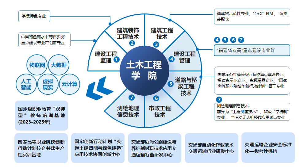 6 | 建設(shè)工程管理 | ①省級(jí)“雙高”道路與橋梁工程技術(shù)專業(yè)群組群專業(yè); ②國(guó)家首批“1+X”制度試點(diǎn)專業(yè)。 | 初心如磐,使命在肩;建設(shè)管理,逐夢(mèng)前行。 |