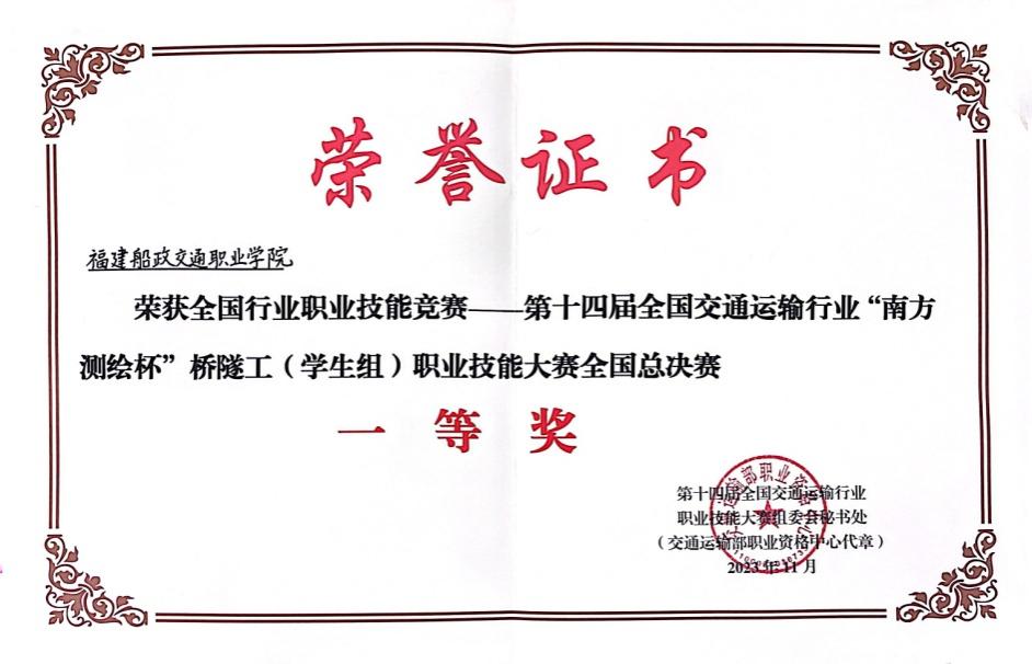獲全國(guó)交通運(yùn)輸行業(yè)橋隧工職業(yè)技能大賽一等獎(jiǎng)