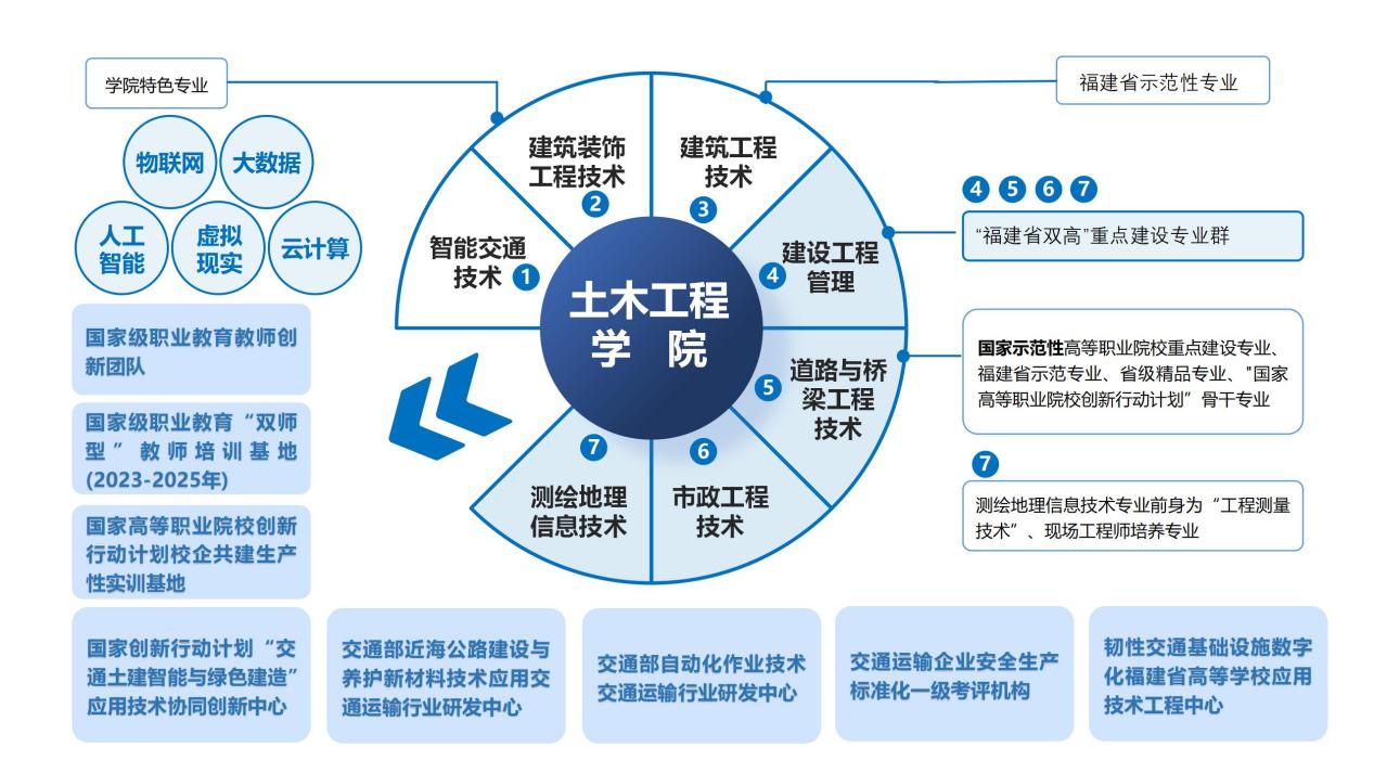土木工程學(xué)院是全省重要的交通工程建設(shè)與管理高技能人才培養(yǎng)基地。現(xiàn)有國(guó)家級(jí)職業(yè)教育教師創(chuàng)新團(tuán)隊(duì)、國(guó)家級(jí)交通土建智能與綠色建造應(yīng)用技術(shù)協(xié)同創(chuàng)新中心、國(guó)家級(jí)職業(yè)教育“雙師型”教師培訓(xùn)基地、國(guó)家高等職業(yè)院校創(chuàng)新行動(dòng)計(jì)劃校企共建生產(chǎn)性實(shí)訓(xùn)基地、交通部自動(dòng)化作業(yè)技術(shù)交通運(yùn)輸行業(yè)研發(fā)中心、交通部近海公路建設(shè)與養(yǎng)護(hù)新材料技術(shù)應(yīng)用交通運(yùn)輸行業(yè)研發(fā)中心,以及韌性交通基礎(chǔ)設(shè)施數(shù)字化福建省高等學(xué)校應(yīng)用技術(shù)工程中心。在校生約3000人,自1974年開(kāi)辦以來(lái),已為行業(yè)輸送超2萬(wàn)名交通土建類相關(guān)專業(yè)畢業(yè)生,為服務(wù)交通強(qiáng)國(guó)戰(zhàn)略,加快建設(shè)交通強(qiáng)國(guó)福建先行區(qū),推動(dòng)福建建設(shè)交通強(qiáng)省、構(gòu)建海峽兩岸融合發(fā)展示范區(qū)和全國(guó)首批公路數(shù)字化轉(zhuǎn)型升級(jí)示范區(qū)提供人才支撐。
