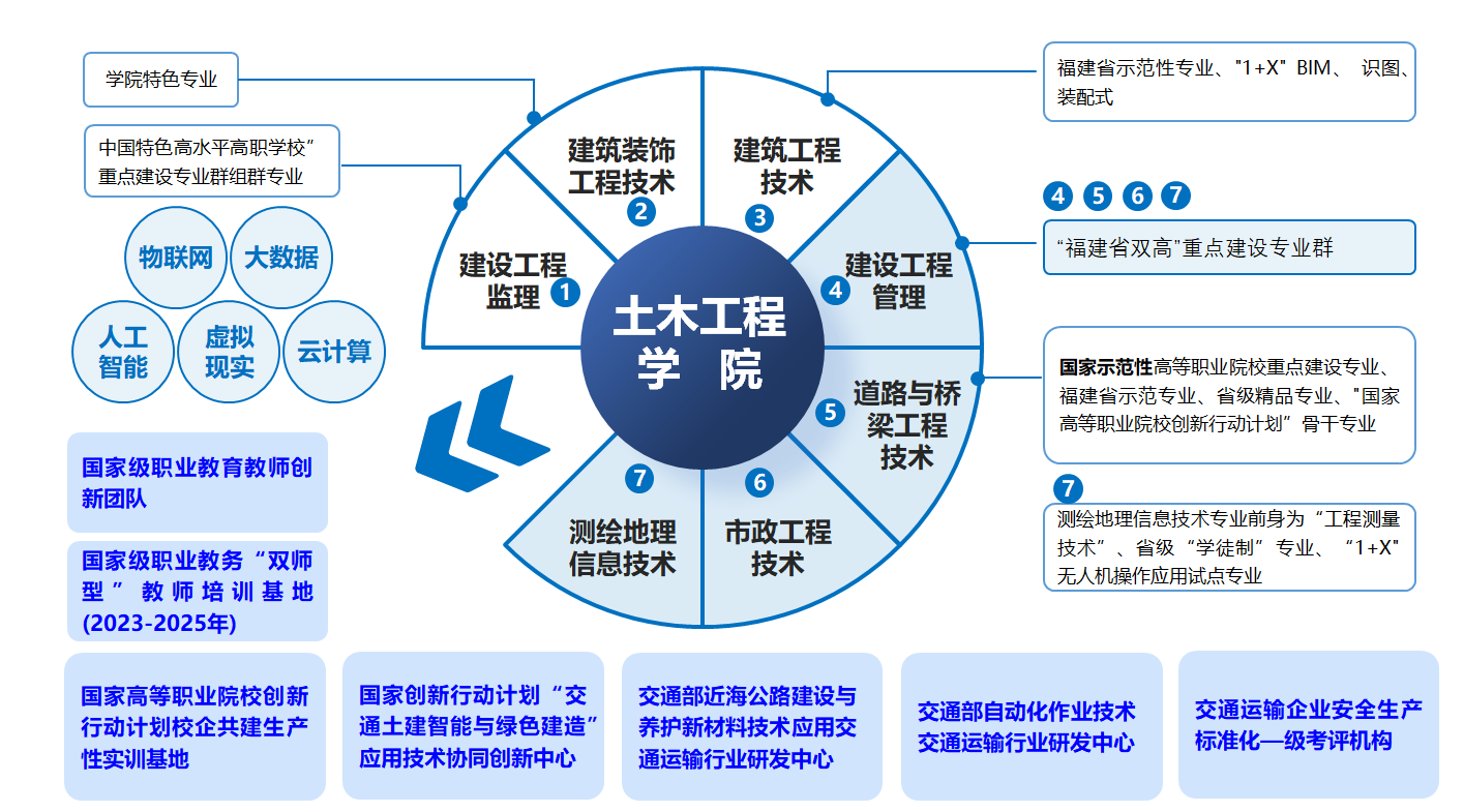 土木工程學(xué)院是全省重要的交通工程建設(shè)與管理高素質(zhì)技術(shù)技能人才培養(yǎng)基地?,F(xiàn)有國(guó)家級(jí)職業(yè)教育教師創(chuàng)新團(tuán)隊(duì)、國(guó)家級(jí)交通土建智能與綠色建造應(yīng)用技術(shù)協(xié)同創(chuàng)新中心、國(guó)家級(jí)職業(yè)教育“雙師型”教師培訓(xùn)基地、國(guó)家高等職業(yè)院校創(chuàng)新行動(dòng)計(jì)劃校企共建生產(chǎn)性實(shí)訓(xùn)基地、交通部自動(dòng)化作業(yè)技術(shù)交通運(yùn)輸行業(yè)研發(fā)中心,交通部近海公路建設(shè)與養(yǎng)護(hù)新材料技術(shù)應(yīng)用交通運(yùn)輸行業(yè)研發(fā)中心,獲交通運(yùn)輸企業(yè)安全生產(chǎn)標(biāo)準(zhǔn)化一級(jí)評(píng)價(jià)機(jī)構(gòu)資質(zhì)。在校生約3500人,自1974年開辦以來,已為行業(yè)輸送超2萬名交通土建類相關(guān)專業(yè)畢業(yè)生,為服務(wù)“交通強(qiáng)國(guó)”戰(zhàn)略,加快建設(shè)交通強(qiáng)國(guó)福建先行區(qū),推動(dòng)福建建設(shè)交通強(qiáng)省、構(gòu)建海峽兩岸融合發(fā)展示范區(qū)提供人才支撐。