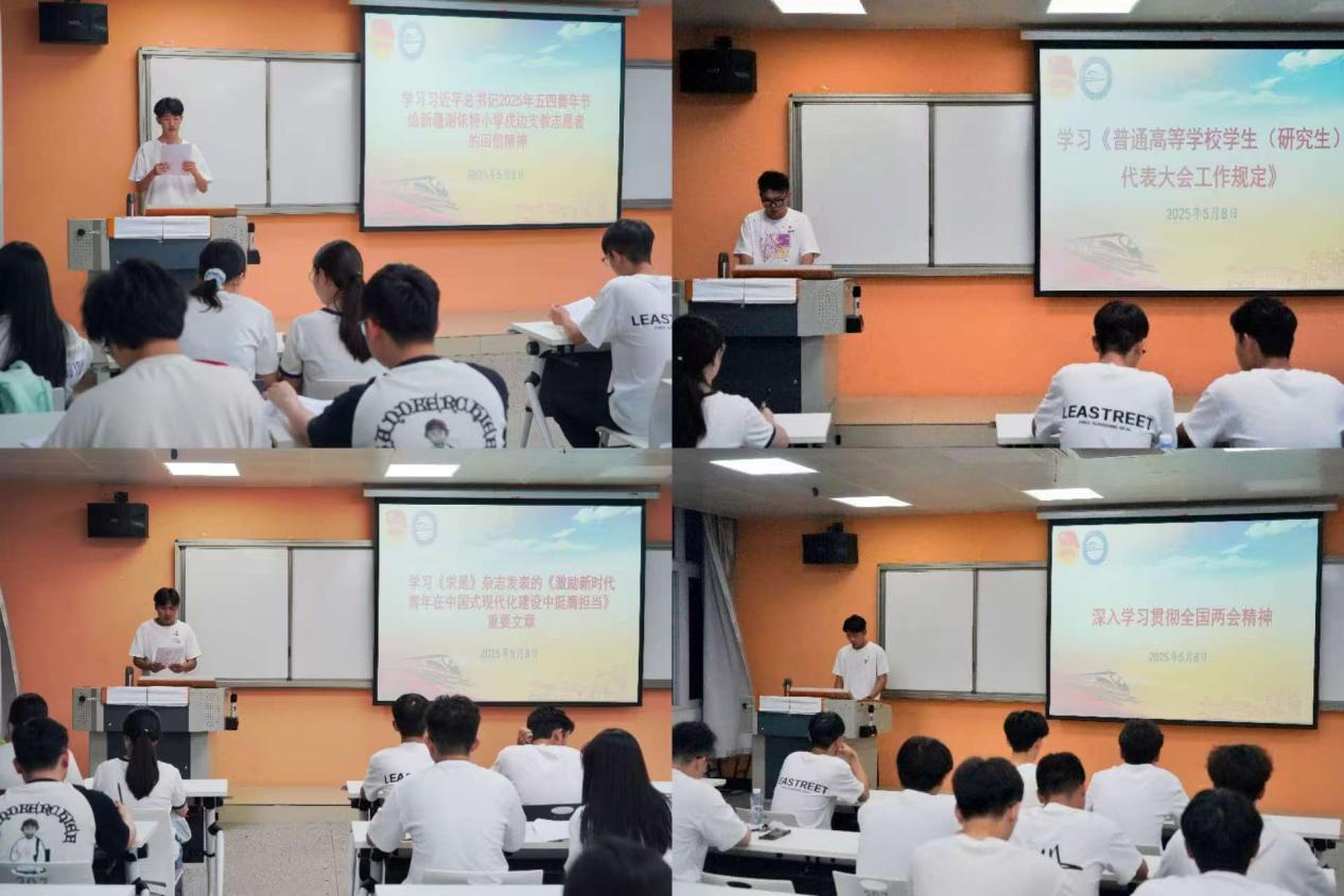 隨后,軌道交通學院分團委志愿者工作部部長辜海峰同學對《普通高等學校學生(研究生)代表大會工作規(guī)定》進行了解讀,強調了學生會的工作流程和職責,使同學們明確了自身的職責與使命。學院學生會執(zhí)行主席管天養(yǎng)同學分享學習習近平總書記給新疆謝依特小學戍邊支教志愿者的回信精神,并進行學生會業(yè)務素質培訓,激勵大家堅定理想信念,勇于擔當作為,為中國式現代化建設貢獻青春力量。學院學生會主席團成員衛(wèi)楠林同學領讀《求是》雜志發(fā)表的《激勵新時代青年在中國式現代化建設中挺膺擔當》重要文章,文章中總書記對青年寄予厚望,強調了青年在中國式現代化建設中的重要作用。衛(wèi)楠林希望大家牢記習近平總書記的殷殷囑托,堅定不移聽黨話、跟黨走,在中國式現代化建設中挺膺擔當!
