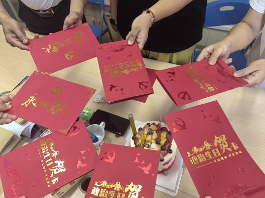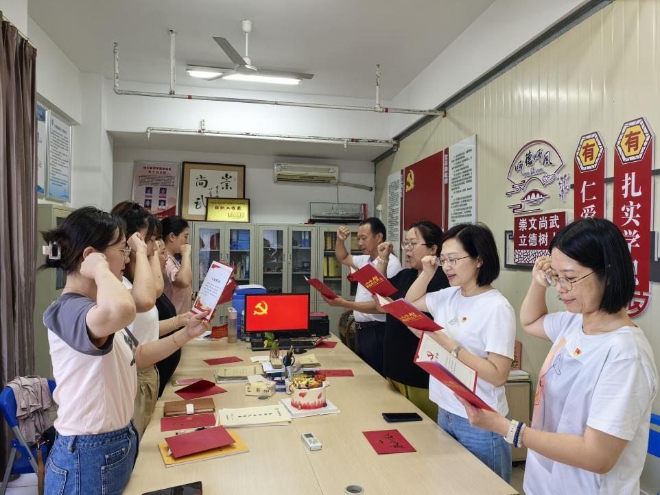活動(dòng)伊始,支部書記為黨員教師贈(zèng)送“政治生日賀卡”。賀卡印刻入黨誓詞與黨員入黨日期,傳遞組織關(guān)懷與責(zé)任囑托。接著,黨員教師面對(duì)黨旗重溫宣誓,鏗鏘誓言響徹會(huì)場(chǎng)。隨后,支部通過(guò)活動(dòng)深化黨員身份認(rèn)同,現(xiàn)場(chǎng)洋溢著“組織溫情”與“紅色力量”的交融共鳴。