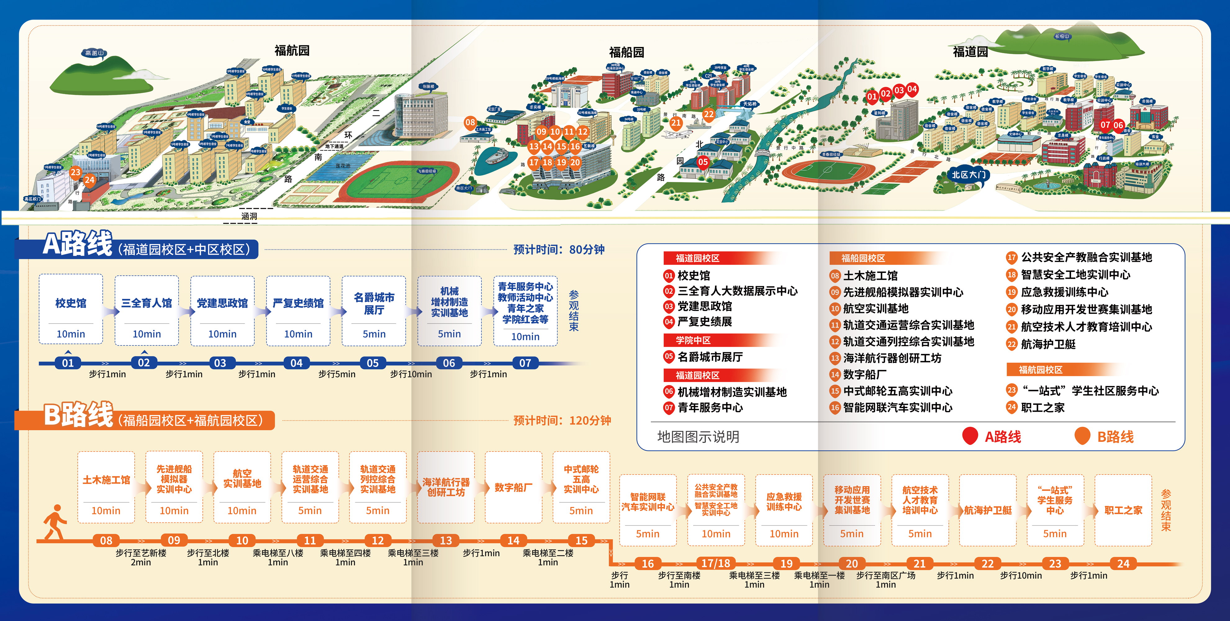 (2)本次開放 23 個(gè)特色場(chǎng)館,分為兩條線路,A 線路為福道 園+中區(qū),B 線路為福船園+福航園。(校史館 6 月投入使用, 建議 6 月份參觀體驗(yàn))