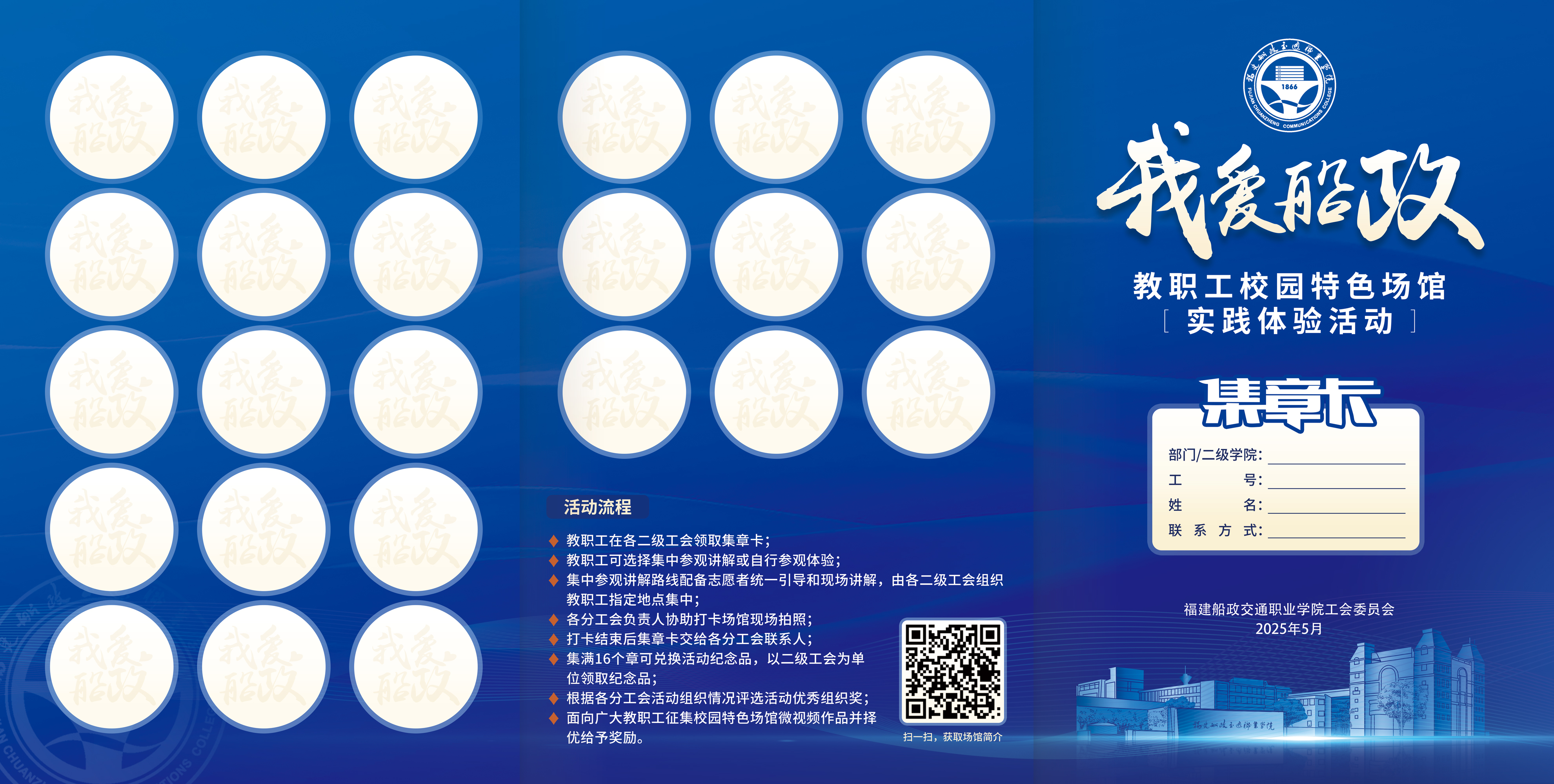 為團(tuán)結(jié)凝聚廣大教職工充分感受學(xué)院職教特色和辦學(xué)成果,激勵(lì)廣大教職員工愛校愛家、團(tuán)結(jié)奮斗、追求卓越,為學(xué)院高質(zhì)量發(fā)展做出新的更大貢獻(xiàn)。學(xué)院工會(huì)聯(lián)合各二級(jí)工會(huì),共同開展“我愛船政”教職工校園特色場(chǎng)館實(shí)踐體驗(yàn)活動(dòng),現(xiàn)將活動(dòng)具體安排通知如下: