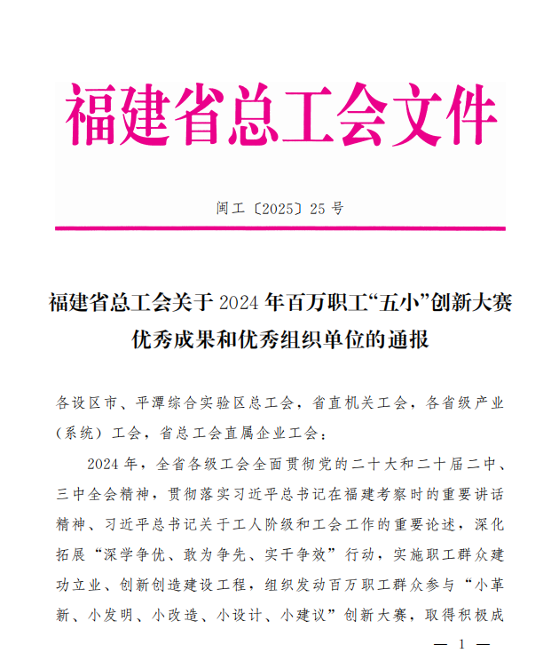 近日,福建省總工會(huì)發(fā)布《關(guān)于2024年百萬(wàn)職工“五小”創(chuàng)新大賽優(yōu)秀成果和優(yōu)秀組織單位的通報(bào)》,我院鄒澤昌省級(jí)勞模工匠創(chuàng)新工作室報(bào)送的創(chuàng)新成果表現(xiàn)優(yōu)異,共斬獲一等獎(jiǎng)1項(xiàng)、二等獎(jiǎng)1項(xiàng)、三等獎(jiǎng)2項(xiàng)。