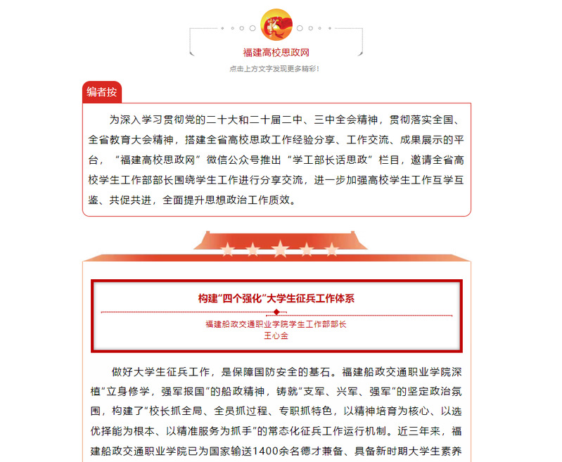 為深入學(xué)習(xí)貫徹黨的二十大和二十屆二中、三中全會精神,貫徹落實全國、全省教育大會精神,搭建全省高校思政工作經(jīng)驗分享、工作交流、成果展示的平臺,“福建高校思政網(wǎng)”微信公眾號推出“學(xué)工部長話思政”欄目,邀請全省高校學(xué)生工作部部長圍繞學(xué)生工作進(jìn)行分享交流,進(jìn)一步加強高校學(xué)生工作互學(xué)互鑒、共促共進(jìn),全面提升思想政治工作質(zhì)效。