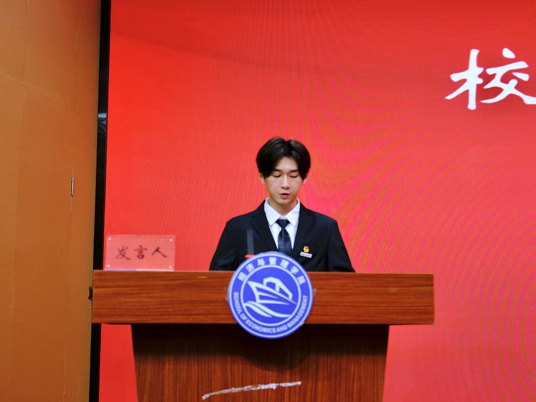 校學(xué)生會主席團(tuán)成員藍(lán)斌代表校學(xué)生會致辭。他高度評價了經(jīng)濟(jì)與管理學(xué)院學(xué)生會在學(xué)院黨總支領(lǐng)導(dǎo)和團(tuán)委、校學(xué)生會指導(dǎo)下取得的各項(xiàng)工作成效,特別是在提升同學(xué)滿意度、大局貢獻(xiàn)度和社會認(rèn)可度,塑造清新陽光組織形象方面所做的努力。藍(lán)斌強(qiáng)調(diào)本次大會是全院同學(xué)政治生活中的一件大事,希望新一屆學(xué)生會以此為契機(jī),持續(xù)加強(qiáng)自身建設(shè),號召全體代表積極履職,為學(xué)生會發(fā)展注入新活力。