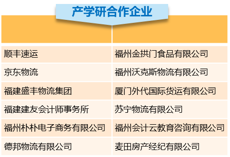 與蘇寧云商股份有限公司、京東物流、順豐速運、麥當勞、盛豐物流集團有限公司、廈門外代國際貨運有限公司、福建建友會計師事務(wù)所、三熊科技90余家大型企業(yè)建立了長期穩(wěn)定的產(chǎn)學研合作及校外實踐教學基地。開展“船政樸樸”“船政德邦物流”“船政蘇寧電器”等訂單班;與金拱門餐飲以及廈門外代國際貨運有限公司合作開展現(xiàn)代學徒制專班;成立電子商務(wù)創(chuàng)新創(chuàng)業(yè)教育改革試點專業(yè)。