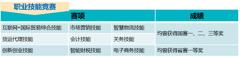 重視雙創(chuàng)教育和學生技能競賽,累計獲得全國“互聯(lián)網(wǎng)+”大學生創(chuàng)新創(chuàng)業(yè)大賽銅獎1項,“挑戰(zhàn)杯”中國大學生創(chuàng)業(yè)計劃競賽國賽銀獎1項,福建省“互聯(lián)網(wǎng)+”大學生創(chuàng)新創(chuàng)業(yè)大賽金獎1項、銀獎4項、銅獎4項,互聯(lián)網(wǎng)+交通”全國職業(yè)院校大學生創(chuàng)新創(chuàng)業(yè)大賽銅獎1項,福建省青年創(chuàng)新創(chuàng)業(yè)大賽二等獎1項,挑戰(zhàn)杯創(chuàng)新創(chuàng)業(yè)省賽金獎1銅獎1。在全國職業(yè)技能競賽中,互聯(lián)網(wǎng)+國際貿(mào)易綜合技能、關(guān)務(wù)技能、智慧物流技能、會計技能、市場營銷技能、貨運代理技能賽項曾獲得國家級一、二、三等獎。智能財稅技能、電子商務(wù)技能、創(chuàng)新創(chuàng)業(yè)技能賽項均曾獲省賽一等獎。