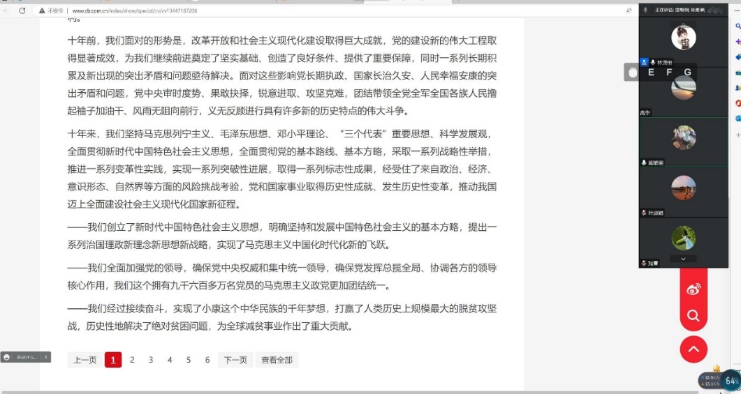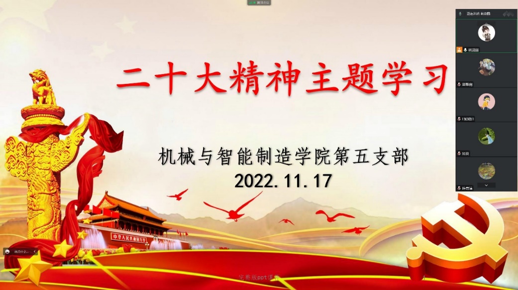 11月17日,機(jī)械與智能制造學(xué)院第五支部利用騰訊會(huì)議,組織黨員深入學(xué)習(xí)黨的二十大精神。通過(guò)黨員讀報(bào)告、談感想等多種形式,進(jìn)一步領(lǐng)會(huì)黨的二十大精神,深刻認(rèn)識(shí)自己肩負(fù)的歷史使命和時(shí)代責(zé)任。
