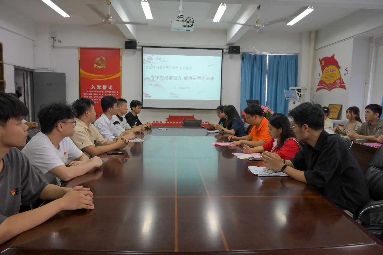 為使畢業(yè)生黨員堅(jiān)定理想信念、增強(qiáng)黨性修養(yǎng)、筑牢信仰之基、明確黨性是黨員立身、立業(yè)、立言、立德的基石。第六黨支部書記吳夢煒領(lǐng)學(xué)了“如何解讀新修訂的《中國共產(chǎn)黨紀(jì)律處分條例》”,通過剖析典型案例,指出畢業(yè)生黨員要深刻認(rèn)識(shí)開展黨紀(jì)學(xué)習(xí)教育的重要意義,切實(shí)增強(qiáng)紀(jì)律觀念和規(guī)矩意識(shí),自覺做到守紀(jì)律、講規(guī)矩;引導(dǎo)畢業(yè)生黨員牢固樹立學(xué)紀(jì)、知紀(jì)、明紀(jì)、守紀(jì)意識(shí),自覺遵守黨的政治紀(jì)律、組織紀(jì)律、廉潔紀(jì)律、群眾紀(jì)律、工作紀(jì)律和生活紀(jì)律,堅(jiān)持做干凈純潔的合格黨員,在工作崗位努力工作、挺膺擔(dān)當(dāng);期盼畢業(yè)生黨員奮勇爭先、建功立業(yè),學(xué)做真人、廉潔從業(yè),系好干事創(chuàng)業(yè)的“第一??圩印?,廉以修身,潔以養(yǎng)德,清風(fēng)同行,行穩(wěn)致遠(yuǎn)。