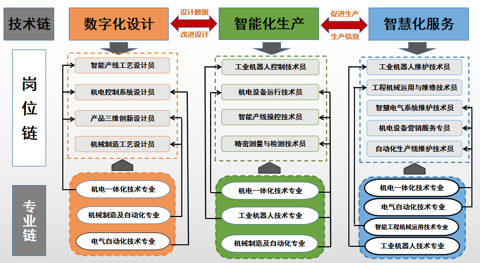 全面對接“中國制造2025”、“數(shù)控一代”、“智能制造”等國家、福建省重大戰(zhàn)略,培養(yǎng)交通機械制造的高端復合型人才、輸出技術(shù)服務(wù)、支撐中小微制造業(yè)企業(yè)轉(zhuǎn)型升級。專業(yè)群聚焦先進制造業(yè)發(fā)展對福建省機電產(chǎn)業(yè)高端的人才需求,圍繞數(shù)字化設(shè)計→智能化生產(chǎn)→智慧化服務(wù)技術(shù)鏈,覆蓋了工程機械與制造領(lǐng)域的數(shù)字化設(shè)計、智能制造、工業(yè)機器人、智能制造控制技術(shù)等關(guān)鍵技術(shù)領(lǐng)域技能型人才培養(yǎng),實現(xiàn)了工程機械等高端機電工業(yè)產(chǎn)品從“前端設(shè)計、中端制造、末端服務(wù)”的生命全周期管理,同時末端服務(wù)信息可以改進設(shè)計、促進生產(chǎn)。專業(yè)鏈與崗位鏈、技術(shù)鏈高度契合,如圖1所示。