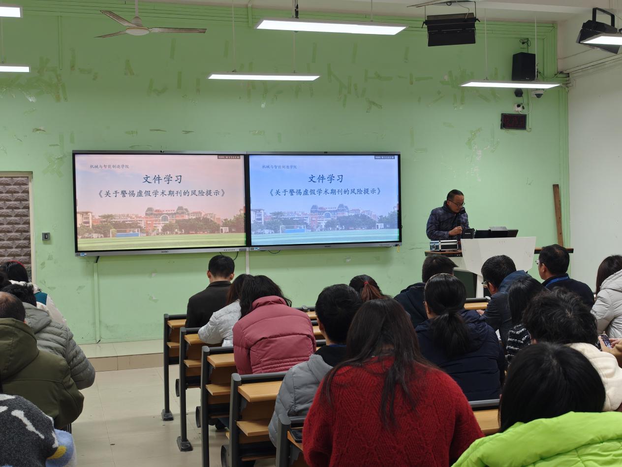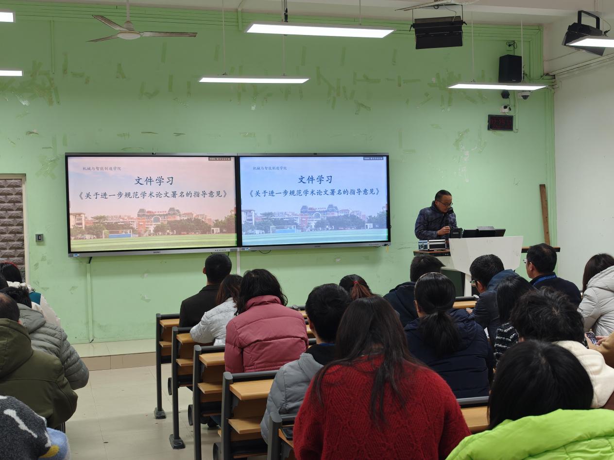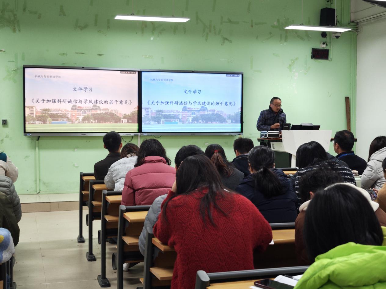 為進(jìn)一步加強(qiáng)科研誠(chéng)信建設(shè),營(yíng)造風(fēng)清氣正的學(xué)術(shù)環(huán)境,培養(yǎng)良好的學(xué)風(fēng),機(jī)械與智能制造學(xué)院于2025年2月19日下午組織全體教職工開展關(guān)于加強(qiáng)科研誠(chéng)信與學(xué)風(fēng)建設(shè)的專題文件學(xué)習(xí)活動(dòng)。此次活動(dòng)旨在深入貫徹落實(shí)國(guó)家關(guān)于科研誠(chéng)信和學(xué)風(fēng)建設(shè)的重要指示精神,推動(dòng)學(xué)院科研與教育工作高質(zhì)量發(fā)展。學(xué)習(xí)會(huì)議由楊開懷院長(zhǎng)主持,陳貴清副院長(zhǎng)領(lǐng)學(xué)。