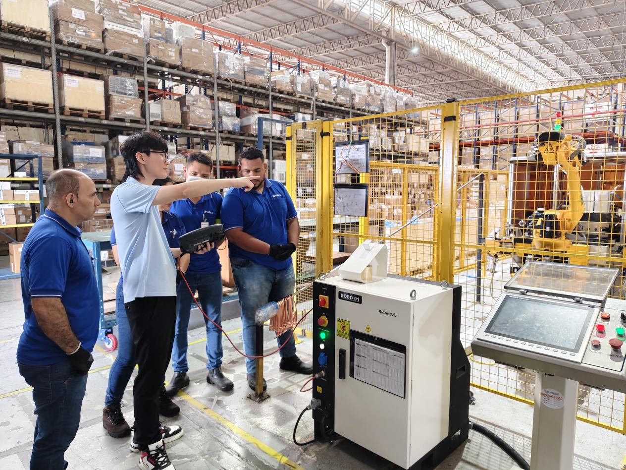 揭牌儀式后,機械學(xué)院教師黃豪杰、陳若宇為巴西基地員工開展為期6天的專業(yè)技能培訓(xùn)。課程緊扣格力巴西生產(chǎn)基地實際需求,在前期線上培訓(xùn)的基礎(chǔ)上,深化設(shè)置液壓驅(qū)動系統(tǒng)故障診斷、智能裝備電氣安全操作、工業(yè)機器人操作維護等模塊,采用“理論+實操”雙元教學(xué)模式,通過解剖液壓系統(tǒng)、電氣安全操作、電路故障排查維護等實踐訓(xùn)練,為巴西當(dāng)?shù)貑T工提供系統(tǒng)的職業(yè)技能培訓(xùn),幫助學(xué)員掌握智能制造設(shè)備維護核心技能,同時實地指導(dǎo)當(dāng)?shù)嘏嘤?xùn)中心實訓(xùn)基地建設(shè)。