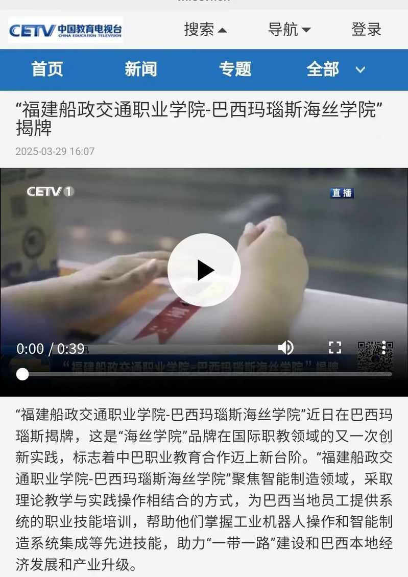 3月29日,中國(guó)教育電視臺(tái)報(bào)道我院在巴西設(shè)立“海絲學(xué)院”,標(biāo)志著中巴職業(yè)教育合作邁上新臺(tái)階。正文如下: