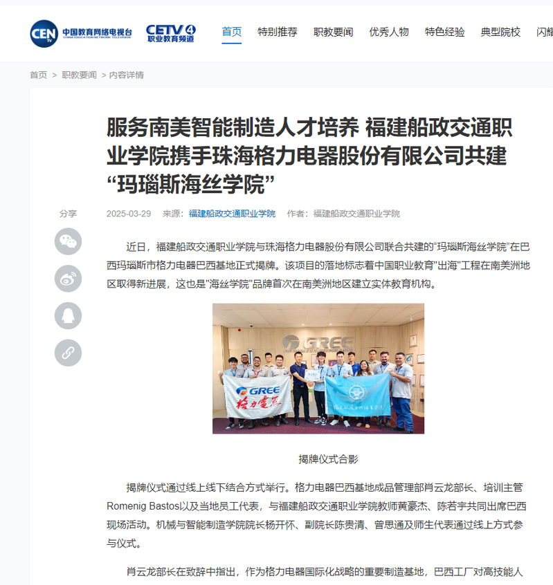 近日,福建船政交通職業(yè)學(xué)院與珠海格力電器股份有限公司聯(lián)合共建的“瑪瑙斯海絲學(xué)院”在巴西瑪瑙斯市格力電器巴西基地正式揭牌。該項目的落地標志著中國職業(yè)教育"出海"工程在南美洲地區(qū)取得新進展,這也是"海絲學(xué)院"品牌首次在南美洲地區(qū)建立實體教育機構(gòu)。