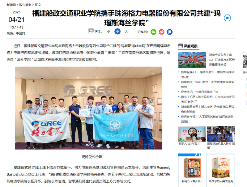 近日,福建船政交通職業(yè)學(xué)院與珠海格力電器股份有限公司聯(lián)合共建的“瑪瑙斯海絲學(xué)院”在巴西瑪瑙斯市格力電器巴西基地正式揭牌。該項(xiàng)目的落地標(biāo)志著中國(guó)職業(yè)教育"出海"工程在南美洲地區(qū)取得新進(jìn)展,這也是"海絲學(xué)院"品牌首次在南美洲地區(qū)建立實(shí)體教育機(jī)構(gòu)。
