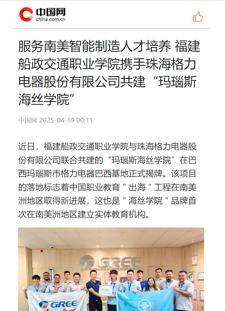 近日,福建船政交通職業(yè)學(xué)院與珠海格力電器股份有限公司聯(lián)合共建的“瑪瑙斯海絲學(xué)院”在巴西瑪瑙斯市格力電器巴西基地正式揭牌。該項(xiàng)目的落地標(biāo)志著中國(guó)職業(yè)教育"出海"工程在南美洲地區(qū)取得新進(jìn)展,這也是"海絲學(xué)院"品牌首次在南美洲地區(qū)建立實(shí)體教育機(jī)構(gòu)。