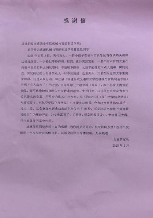 5月3日,福州市長(zhǎng)樂區(qū)古槐鎮(zhèn)嶼頭湖游船上一兒童腳下踩空,不慎落水。機(jī)械與智能制造學(xué)院2023級(jí)智能工程機(jī)械運(yùn)用技術(shù)2班林佳星同學(xué)正在此游船上看風(fēng)景,聽到呼救聲后,他立即挺身而出,毫不猶豫跳入湖中將落水的女童成功救起。