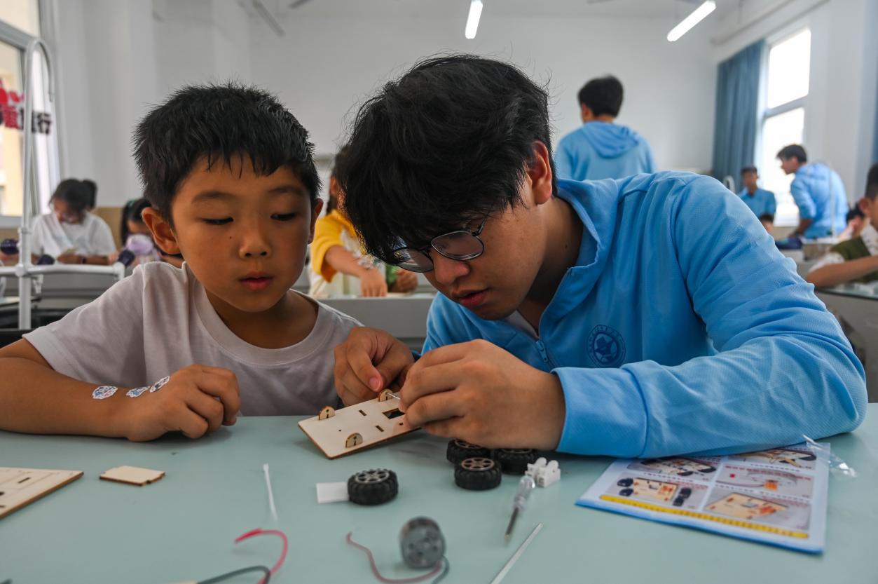 (實(shí)踐團(tuán)成員指導(dǎo)小朋友們制作“月球車”)