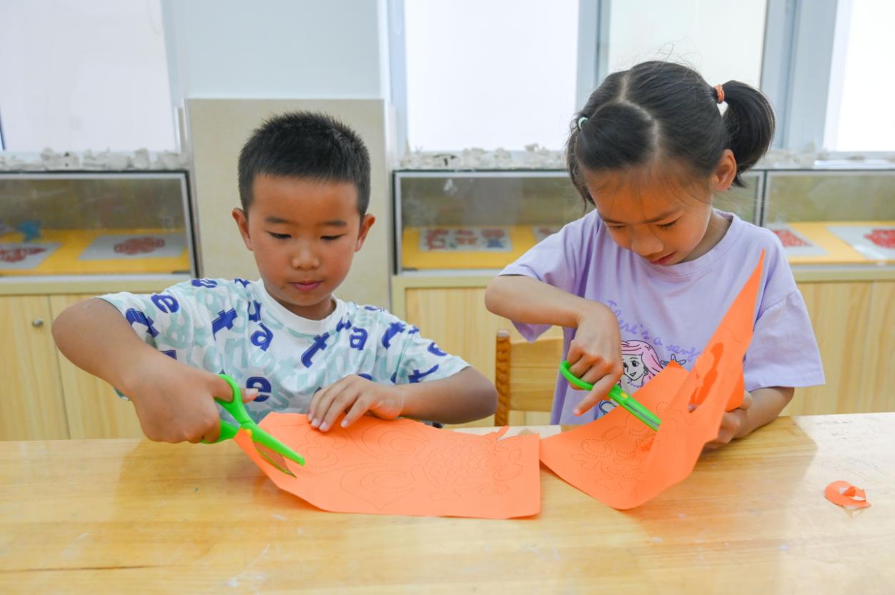 在橙色育美課堂中,實(shí)踐團(tuán)巧妙融合學(xué)院深厚的藝術(shù)傳統(tǒng),精心打造了一系列啟迪童心、傳承文化的非遺體驗(yàn)與創(chuàng)意手工活動(dòng),讓傳統(tǒng)文化在指尖流轉(zhuǎn),藝術(shù)之美浸潤(rùn)心田?!昂材h香”環(huán)節(jié),實(shí)踐團(tuán)教孩子們執(zhí)筆運(yùn)腕,在墨香中感受筆畫的舒展遒勁,觸摸漢字風(fēng)骨。“柘榮非遺剪紙”里,孩子們聽民俗故事、學(xué)剪法,紅紙上綻放的鏤空?qǐng)D案,傳遞著鄉(xiāng)土智慧與吉祥寓意。“陶土生花”工坊中,孩子們?nèi)嗄筇胀了苄?,在?shí)踐團(tuán)講解中感受陶藝傳承,領(lǐng)悟“百煉方成器”的哲思。而作為課堂重頭戲的“非遺蠶絲扇”制作,更是讓孩子們沉醉其中:實(shí)踐團(tuán)先講述蠶絲扇的千年傳承,從蠶桑養(yǎng)殖到蠶絲織造,再到扇面繪制的獨(dú)特技藝。“竹編畫”編織生活巧思。孩子們?cè)趯?shí)踐中觸碰文化肌理,激發(fā)創(chuàng)造潛能,心靈被傳統(tǒng)文化滋養(yǎng)得澄澈動(dòng)人。