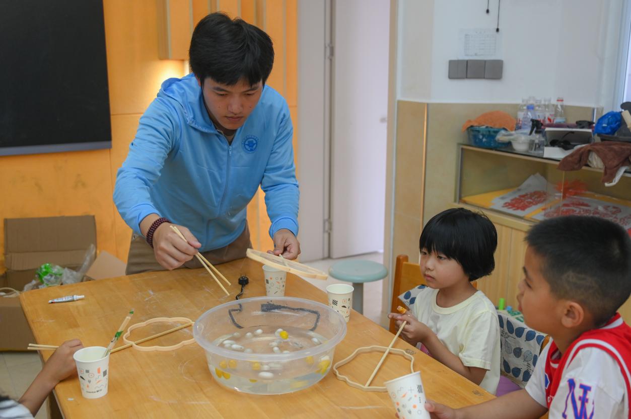 (實(shí)踐團(tuán)成員指導(dǎo)小朋友制作手工)