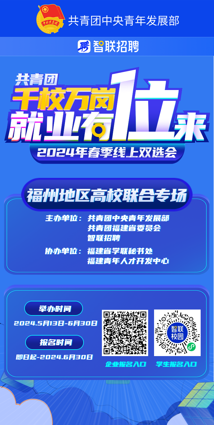 為深入貫徹團(tuán)中央促進(jìn)大學(xué)生就業(yè)行動(dòng),切實(shí)為畢業(yè)生提供就業(yè)崗位信息、暢通求職渠道、為用人單位和畢業(yè)生搭建供需橋梁,幫助促進(jìn)高校畢業(yè)生更加充分更高質(zhì)量就業(yè)?,F(xiàn)舉辦“千校萬(wàn)崗 就業(yè)有位來(lái)”2024年福州地區(qū)高校畢業(yè)生春季聯(lián)合專(zhuān)場(chǎng)線上招聘會(huì),重點(diǎn)面向福州、莆田2024屆及往屆未就業(yè)所有高校畢業(yè)生,誠(chéng)邀各用人單位及畢業(yè)生報(bào)名參會(huì)?,F(xiàn)將有關(guān)事項(xiàng)函告如下: