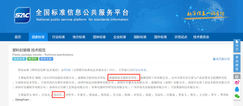 近日,國家市場監(jiān)督管理總局、國家標(biāo)準(zhǔn)化管理委員會發(fā)布中華人民共和國國家標(biāo)準(zhǔn)公告(2024年第22號),以我校作為第三起草單位、省級技能大師工作室領(lǐng)辦人鄒澤昌作為起草人的國家標(biāo)準(zhǔn)《塑料封裝模 技術(shù)規(guī)范》(GB/T 14663-2024)獲批發(fā)布,將于2025年4月1日開始實施。該標(biāo)準(zhǔn)是我校中國特色高水平高職學(xué)校建設(shè)的又一項重要成果。