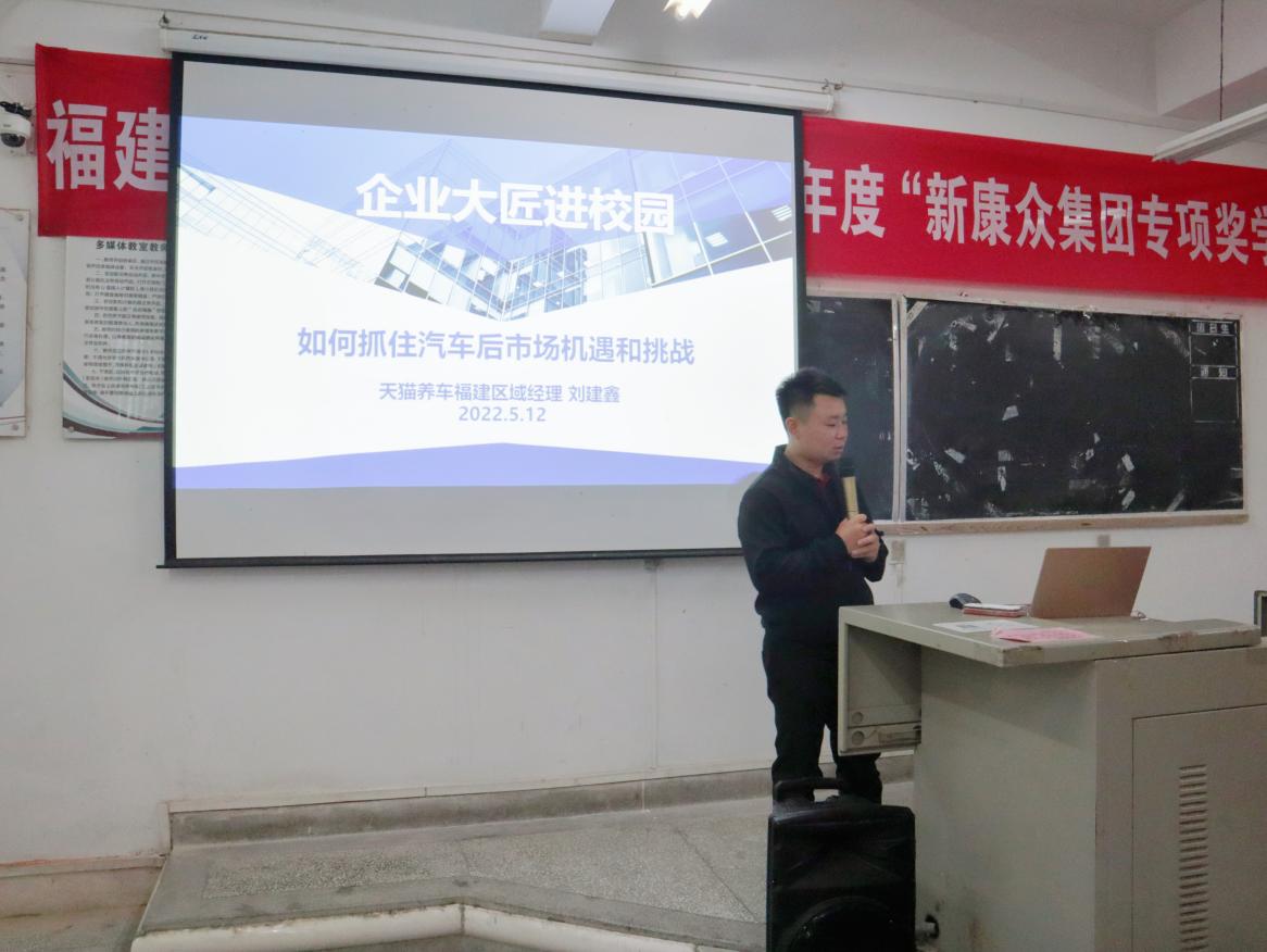 2022年5月12日,由新康眾集團(天貓養(yǎng)車)福建區(qū)域經理劉建鑫,主管陳玲一行蒞臨汽車學院舉行專場招聘會暨新康眾獎學金發(fā)放儀式。汽車學院蔡華錦書記、朱劍寶副院長、教研室主任及部分骨干教師參加了本次交流。劉建鑫經理為畢業(yè)生們講述了面對疫情如何抓住汽車后市場機遇和挑戰(zhàn),新康眾集團目前為我校提供涵蓋全省九地市的30多個崗位。希望繼續(xù)與汽車學院在人才培養(yǎng)、文化傳承等方面開展深度合作,實現產教融合、互利共贏。在劉經理宣講之后,新康眾集團進行專項獎學金的頒發(fā)。