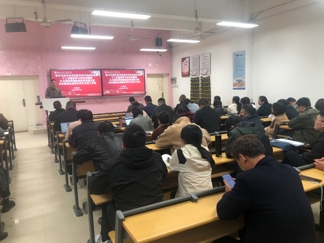 2024年3月13日在2號樓1-3會議室汽車學院組織全體教職工學習習近平總書記在中共中央政治局第十二次集體學習時講話精神,會議由學院黨總支書記蔡華錦主持。