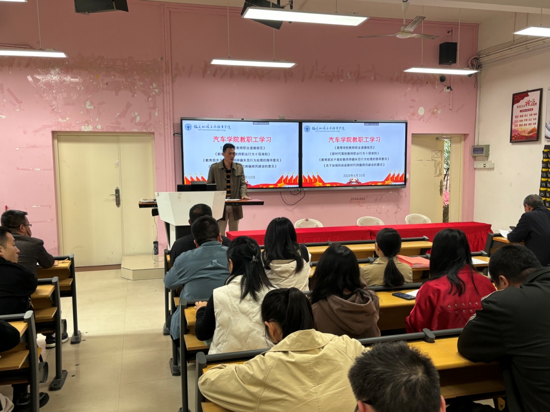 2024年4月10日,汽車學(xué)院在北區(qū)自強(qiáng)樓召開(kāi)師德師風(fēng)專題教育會(huì),學(xué)院黨總支書記蔡華錦主持,全體教職工參加會(huì)議。