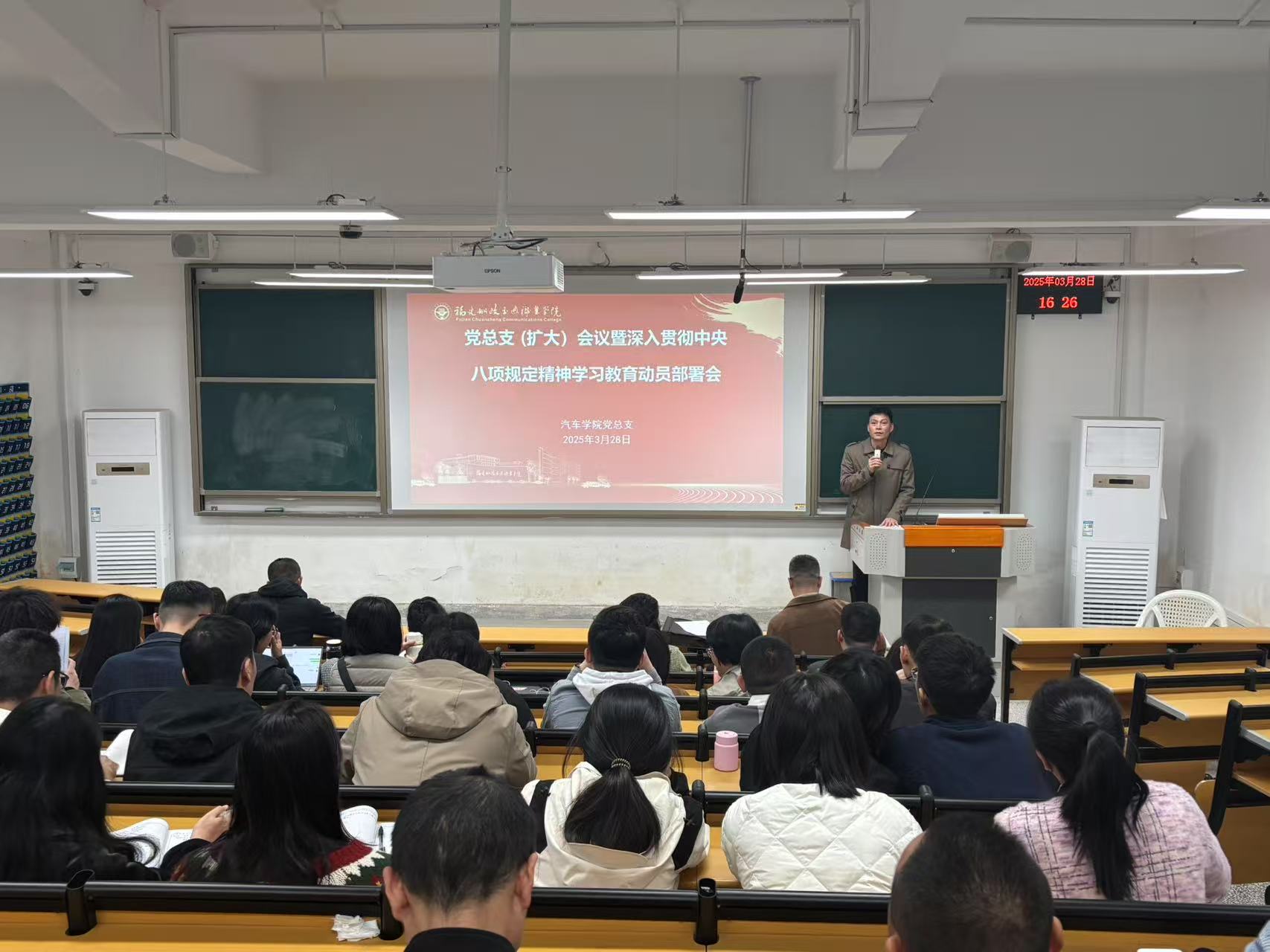 3月28日,汽車學院黨總支(擴大)會議在汽一階教室召開。會議認真學習貫徹習近平總書記關(guān)于深入貫徹中央八項規(guī)定精神學習教育的重要講話和重要指示精神,傳達校黨委(擴大)會議暨深入貫徹中央八項規(guī)定精神學習教育部署會會議精神,布置學校學習教育工作方案,并動員部署學習教育工作。會議由學院黨總支書記蔡華錦主持,全體黨員參加會議。