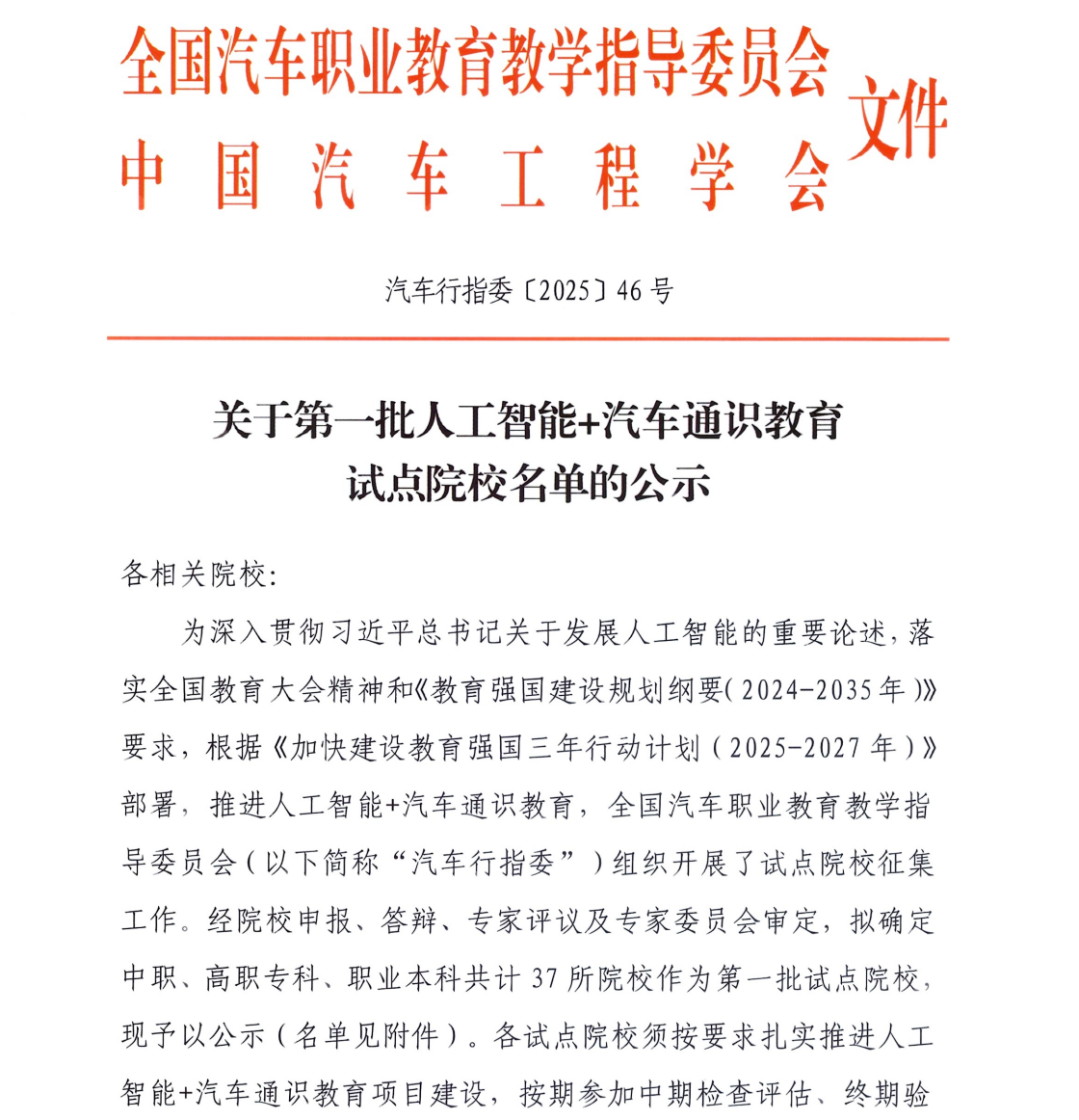 為深入貫徹落實習(xí)近平總書記關(guān)于發(fā)展人工智能的重要指示精神,落實全國教育大會精神和《教育強(qiáng)國建設(shè)規(guī)劃綱要(2024-2035年)》要求,根據(jù)《加快建設(shè)教育強(qiáng)國三年行動計劃(2025-2027年)》及教育部等九部門《關(guān)于加快推進(jìn)教育數(shù)字化的意見》等文件精神,在人工智能技術(shù)全面賦能職業(yè)教育發(fā)展的新階段,我院積極推進(jìn)人工智能技術(shù)深度賦能職業(yè)教育,近期成功獲批兩項全國汽車行指委第一批“‘AI+’汽車職業(yè)教育大模型應(yīng)用示范院校培育試點”和“人工智能+汽車通識教育試點院?!薄?/span>